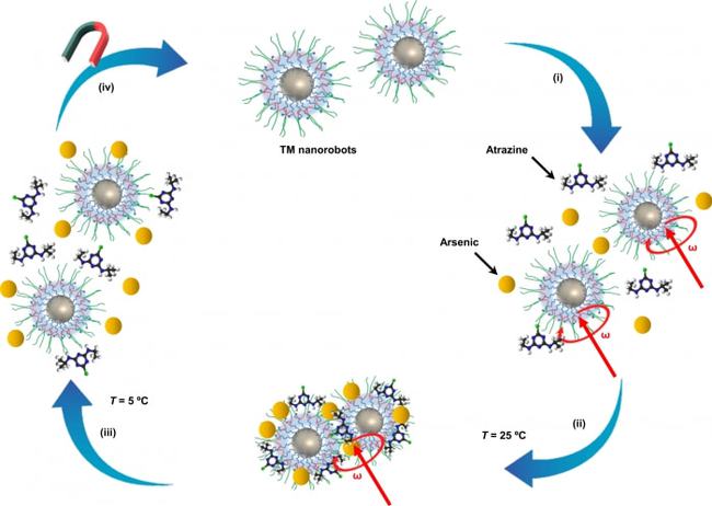 在凉水中,这些微型机器人分散开来。纳米机器人的温度敏感塑料作为机器人的“手”,机器人用它来吸附像砷这样的微小污染物。一旦水温升高,机器人就会聚集在一起,拖着它们收集的污染物,机器人和污染物都可以用磁铁轻松提取出来。然后,一旦这些微小的机器人冷却并分离,污染物就可以被安全地卸下,纳米机器人也可以被重新使用。