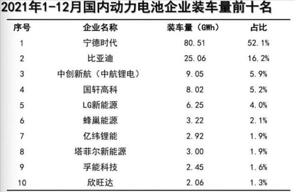 中国汽车动力电池产业创新联盟数据显示,2021 年宁德时代以 80.51Gwh 的装车量占据国内动力电池市场份额的 52%,而欣旺达仅占国内动力电池市场份额的 1.3%。