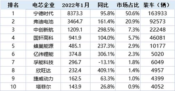 据动力电池应用分会数据显示,2022 年 1 月中国市场动力电池装机量约为 16.56GWh,同比增长 95.3%。欣旺达动力电池装机量达到 232.4MWh,位居全国第8,同比增幅超过 400%,增速远超其余上榜的电池企业。