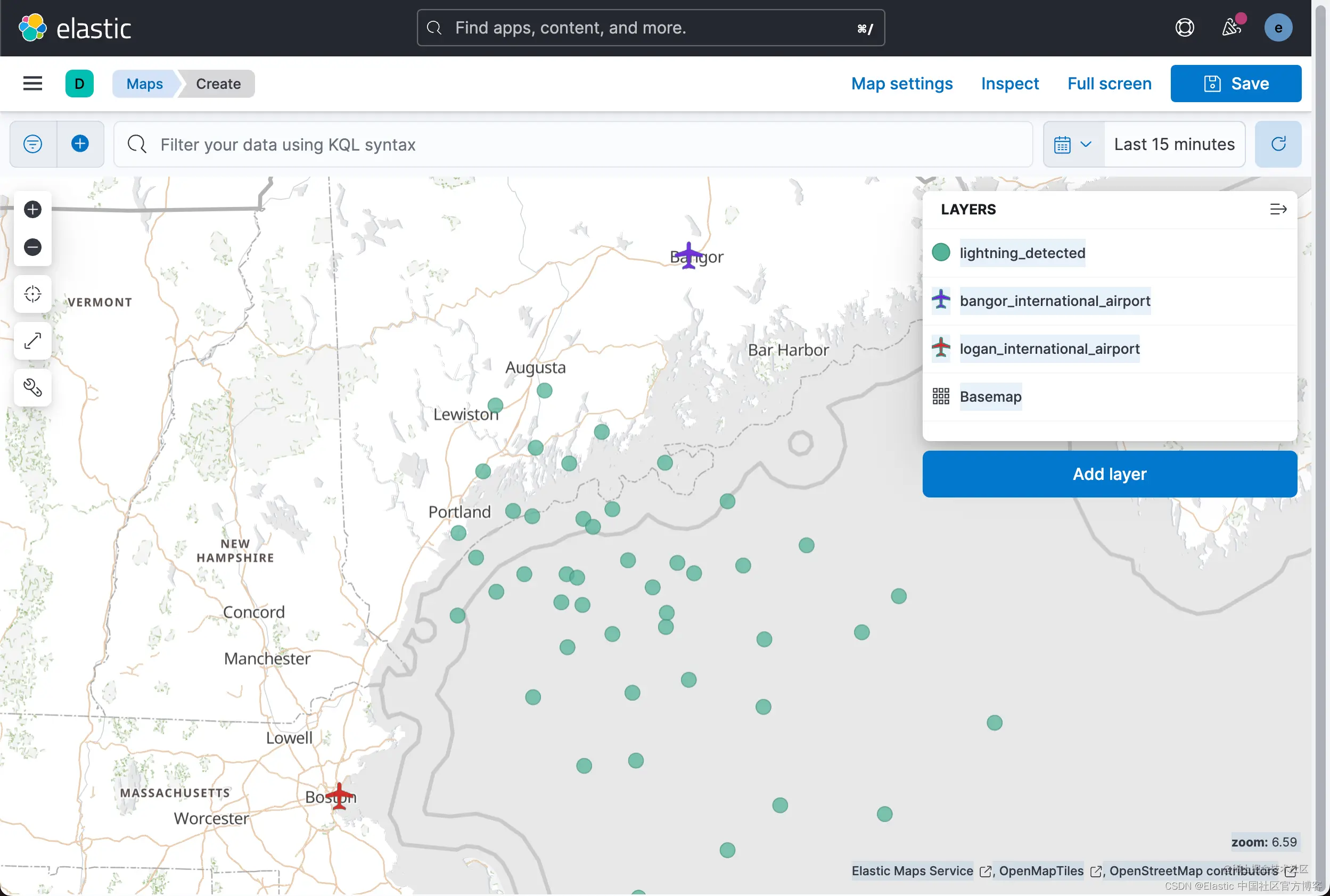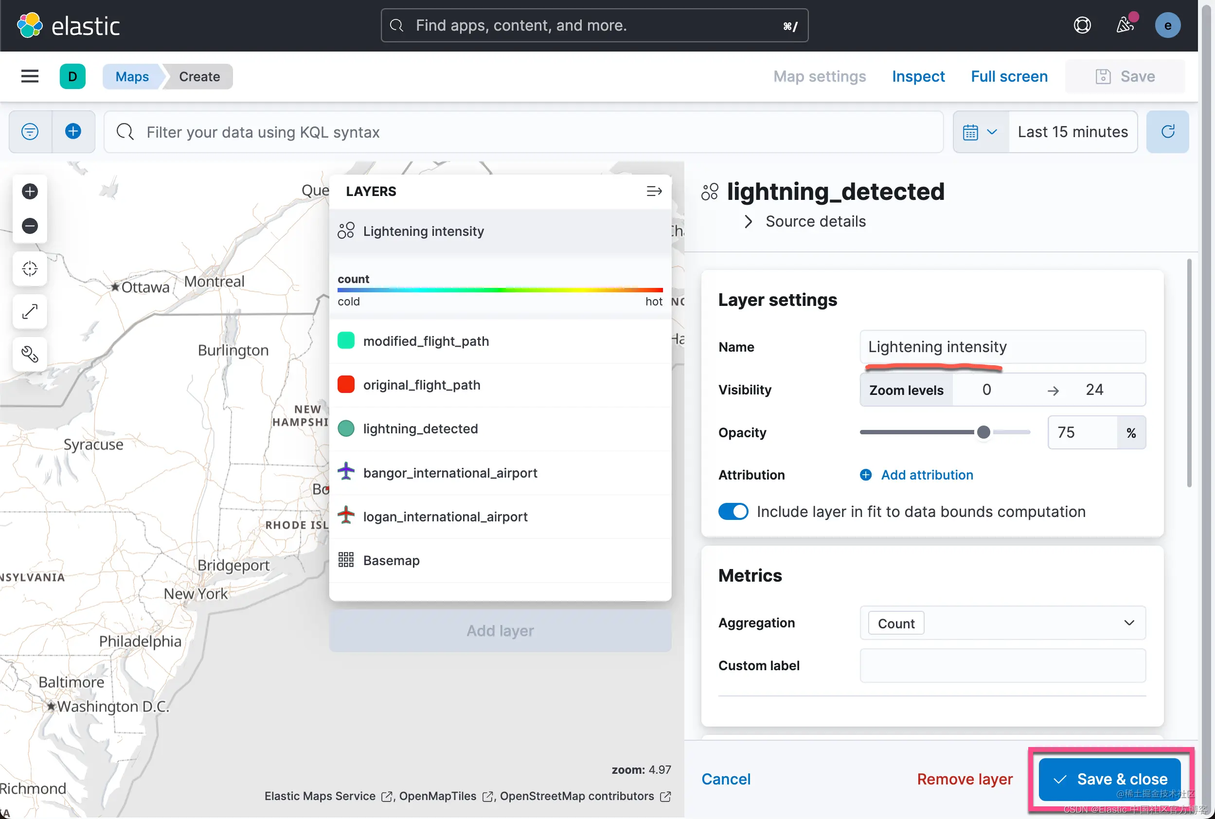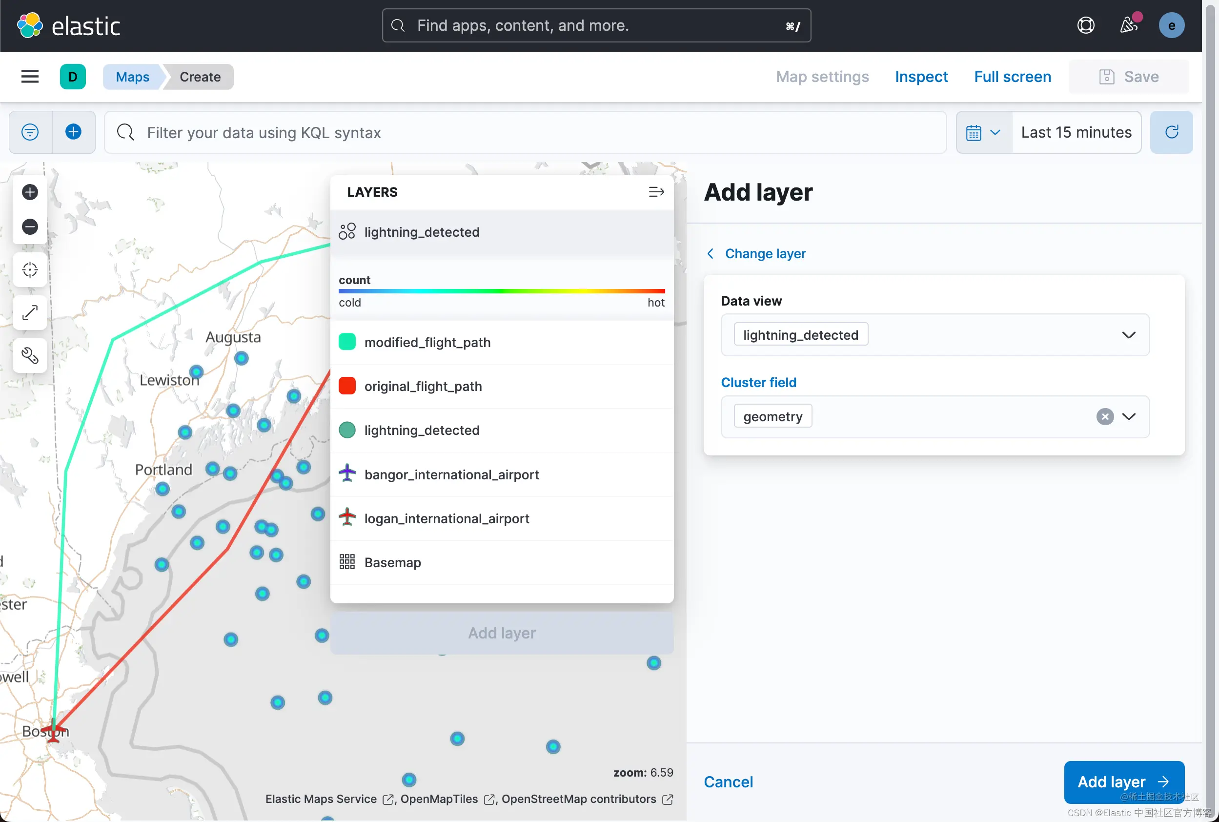 查看 Lightning detected 层,可以清楚地看到闪电击中的位置。 不太清楚的是,某些地区是否比其他地区发生了更多的雷击,换句话说,闪电热点在哪里。 为雷击建立索引的 geo_point 数据的一个优点是你可以对数据执行聚合。