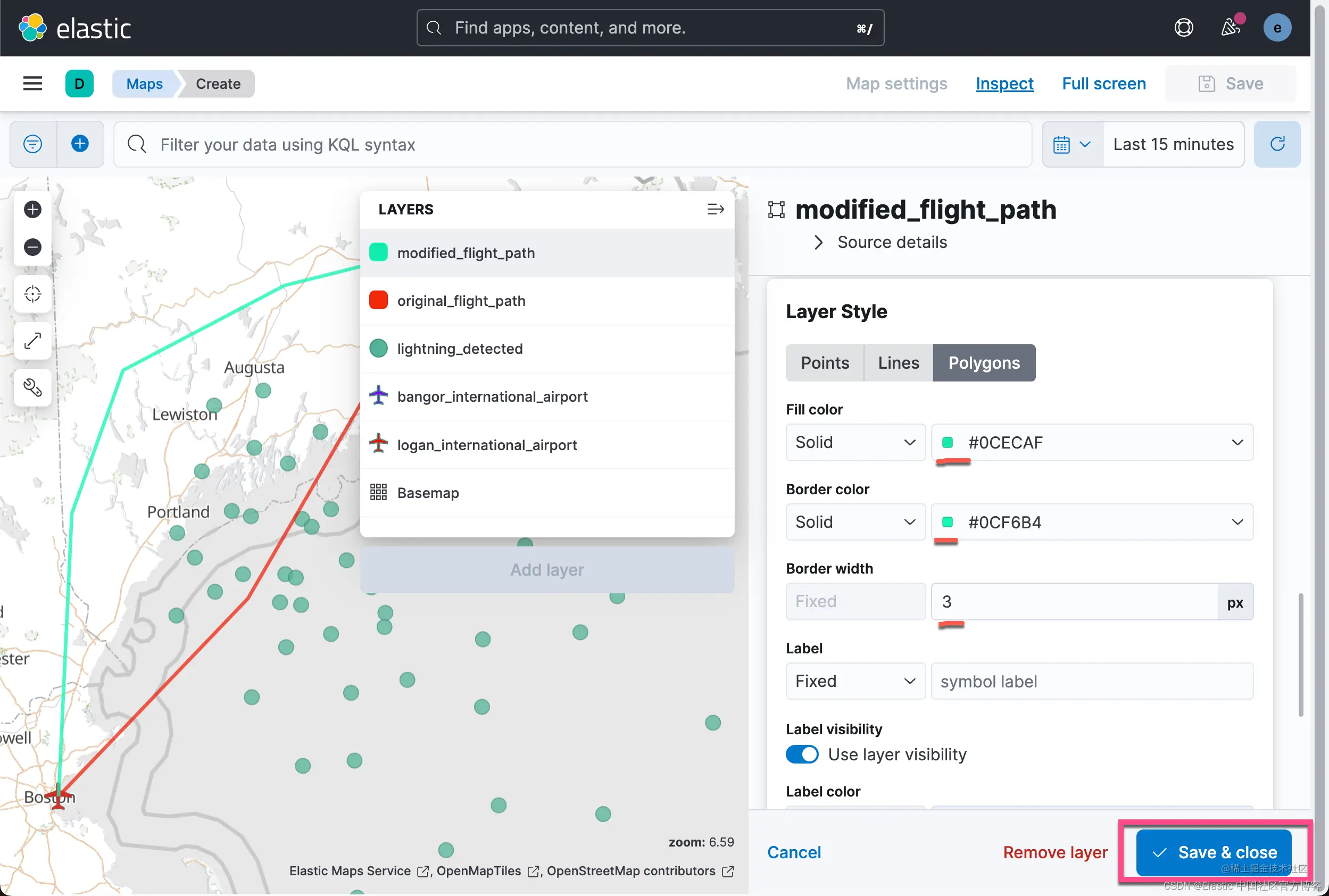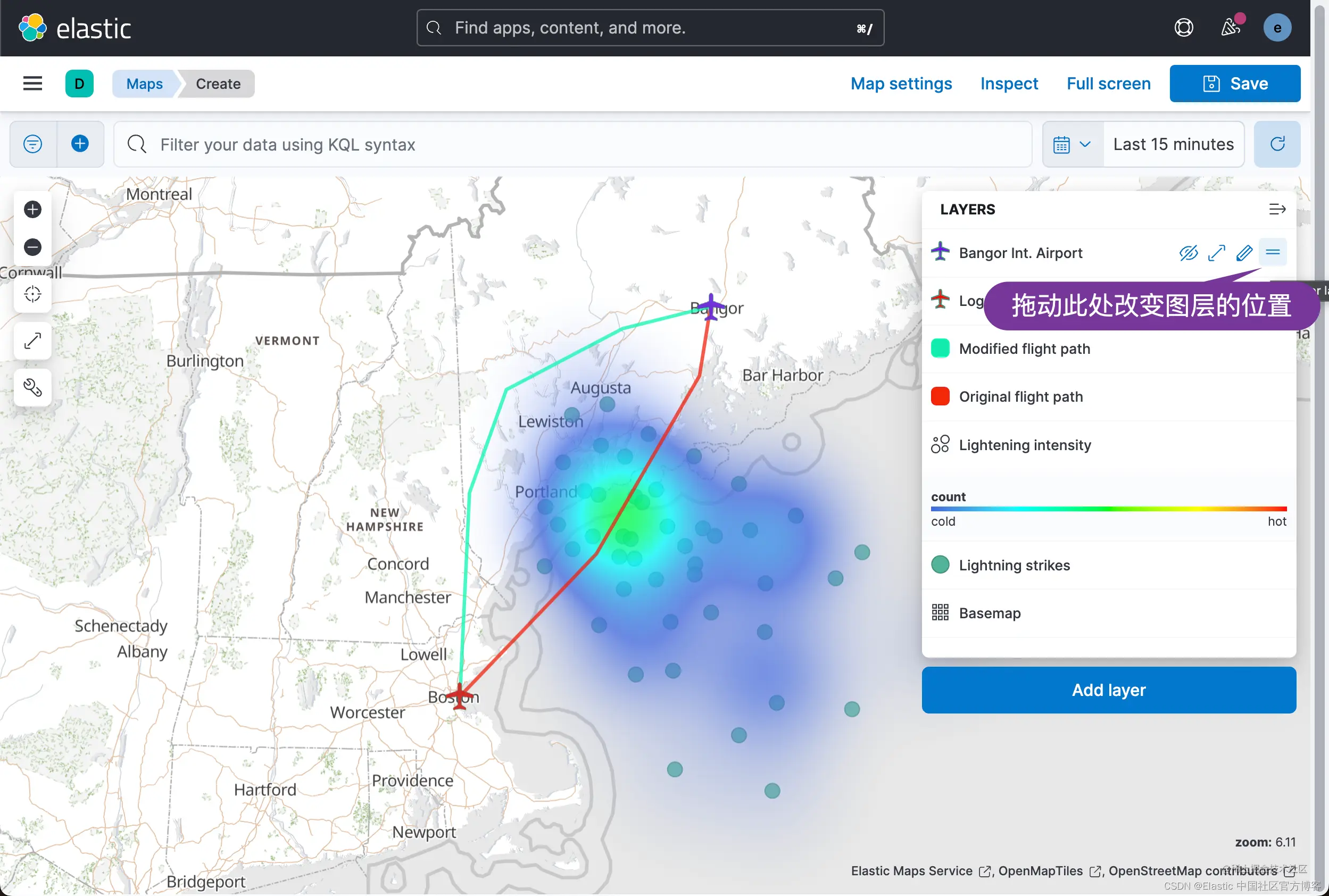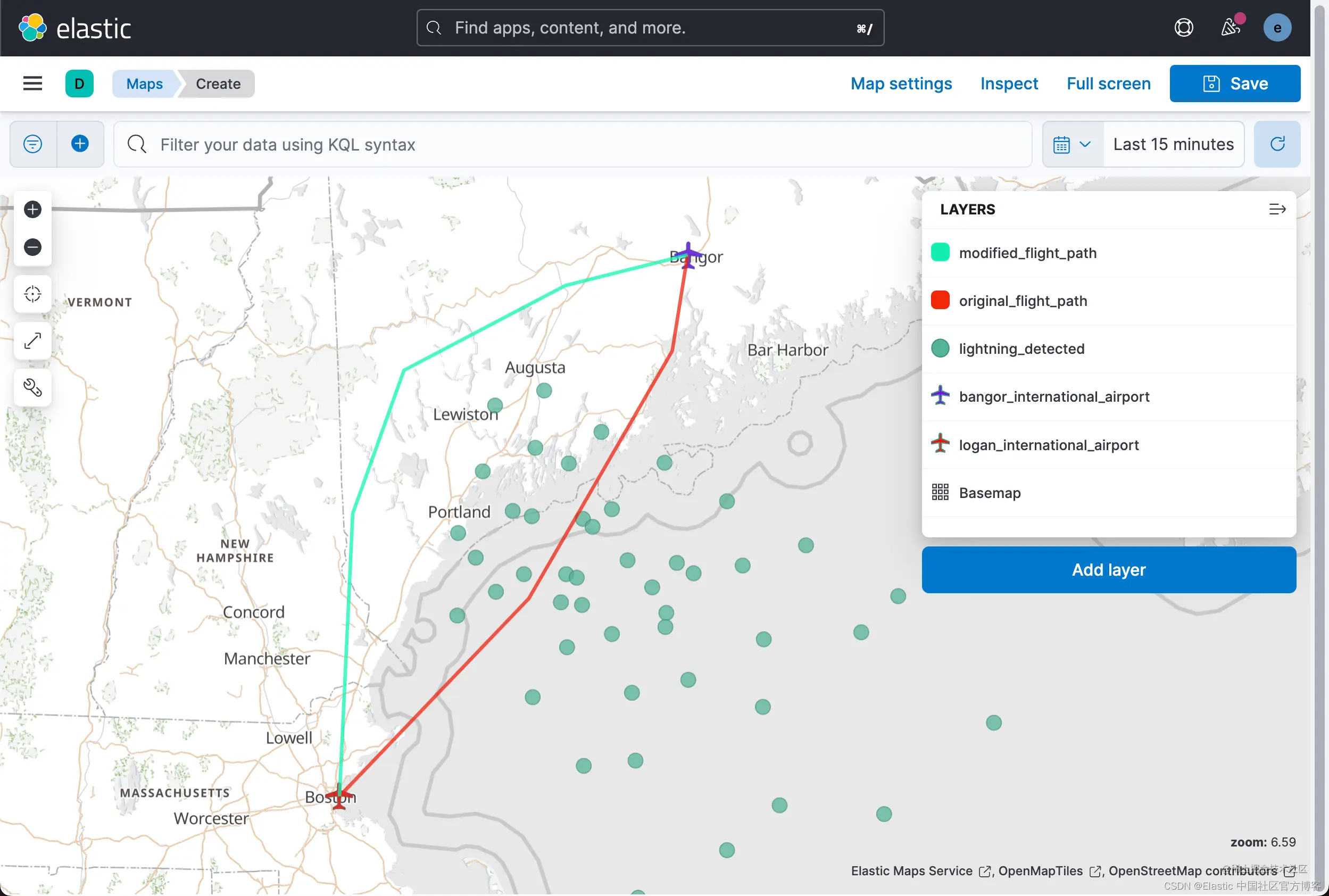 查看 Lightning detected 层,可以清楚地看到闪电击中的位置。 不太清楚的是,某些地区是否比其他地区发生了更多的雷击,换句话说,闪电热点在哪里。 为雷击建立索引的 geo_point 数据的一个优点是你可以对数据执行聚合。