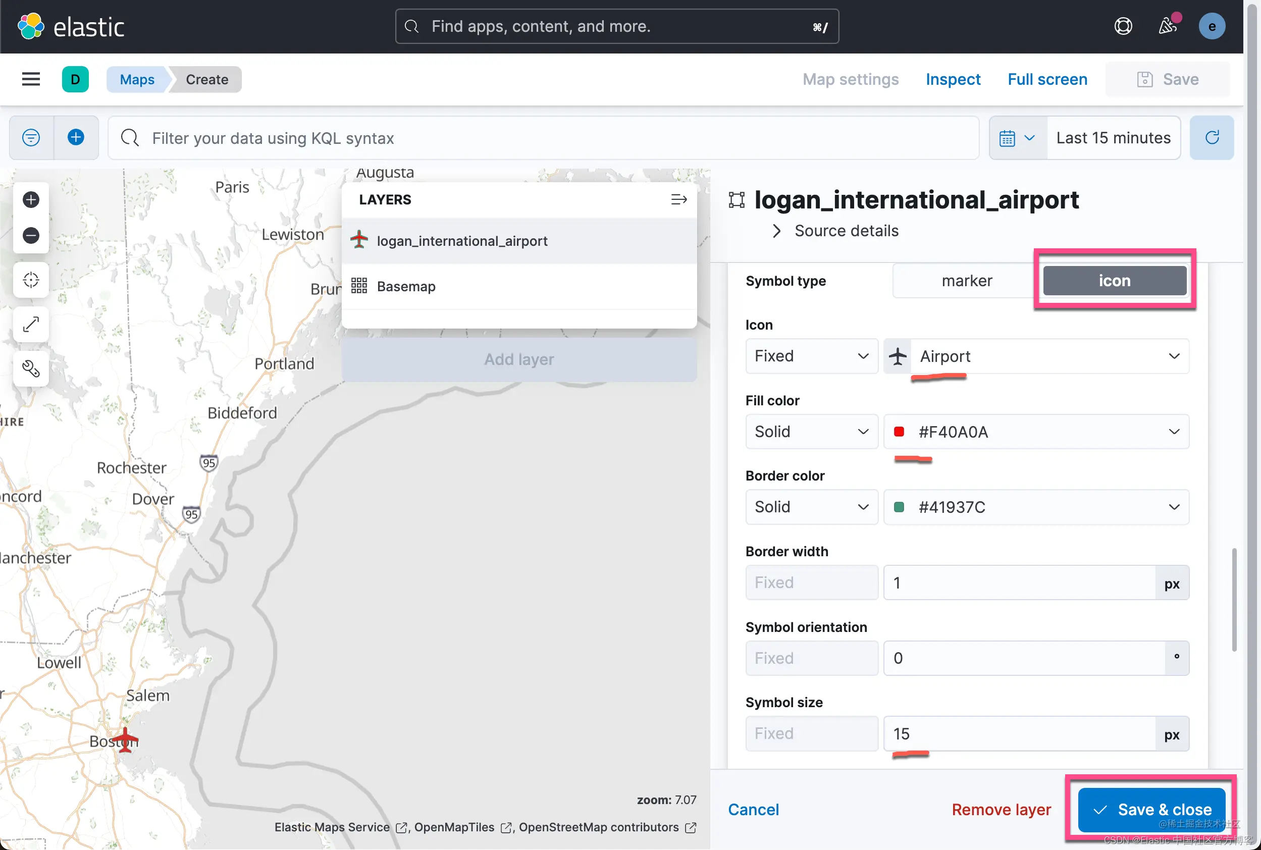 我进一步对这个机场进行定制。我们使用 icon 来表示这个机场。点击上面的 Save & close: