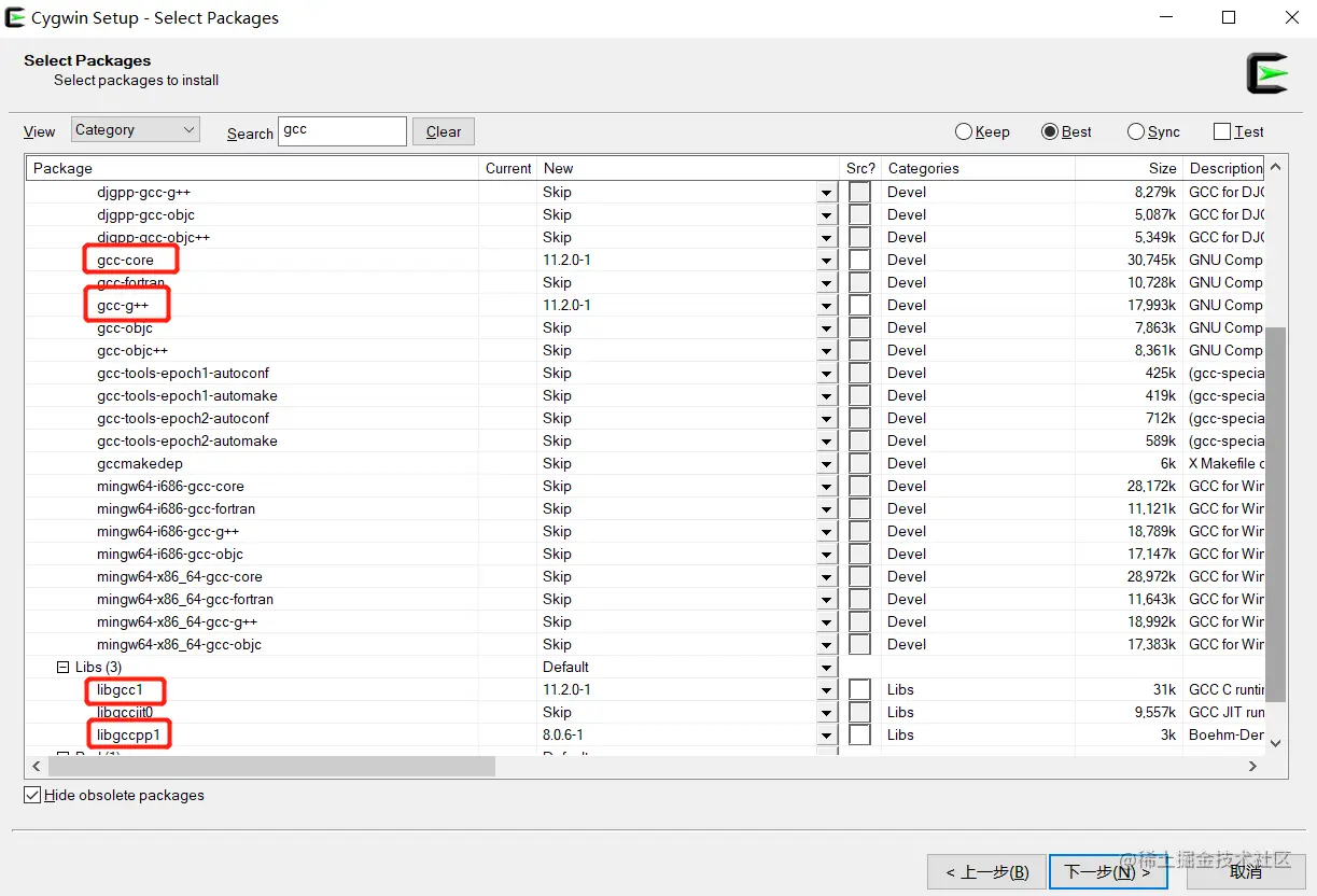 接下来选择需要下载安装的组件包,我们只需要下载我们编译相关的模块即可。先通过上面的搜索框进行定位,选择安装Devel模块下面的make、gcc-core,gcc-g++,以及Libs模块下的libgcc1 、libgccpp1,然后点击New这一列的Skip,选择要安装的版本号,全部添加完成后点击下一步: