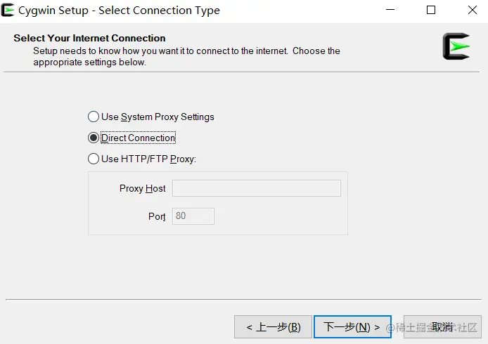 网络连接配置这里选择第二项,也就是直接连接,不需要任何代理方式: