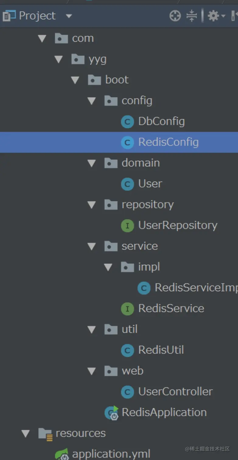 package com.yyg.boot; import org.springframework.boot.SpringApplication; import org.springframework.boot.autoconfigure.SpringBootApplication; /** * @Author 一一哥Sun * @Date Created in 2020/4/8 * @Description Description */ @SpringBootApplication public class RedisApplication { public static void main(String[] args){ SpringApplication.run(RedisApplication.class,args); } } 复制代码11. 项目结构